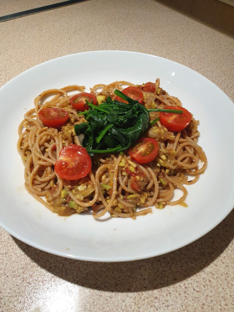 - Put the spaghetti in pot and add 1 pint of veg stock